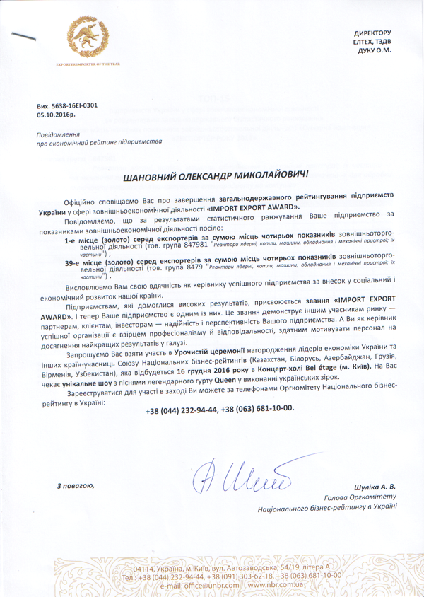 По результатам общегосударственного рейтинга предприятий Украины в сфере внешнеэкономической деятельности "IMPORT EXPORT AWARD" наше предприятие