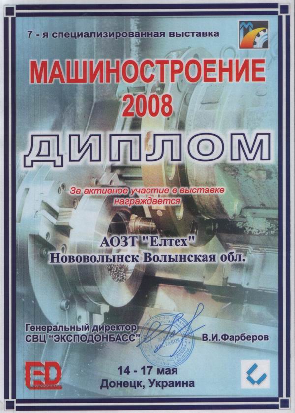 По результатам участия в выставке "Машиностроение-2008 " 14-17 мая в г. Донецк ,